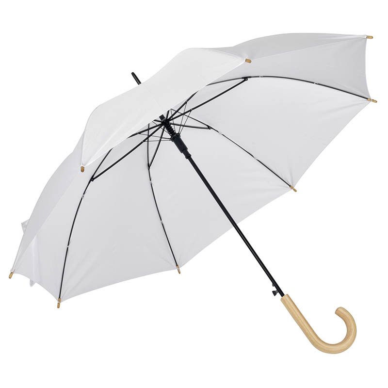 Automatický vetruodolný dáždnik s 8 panelmi, drevenou rukoväťou, kovovým rámom a sklolaminátovými rebrami. Recyklovaný PET pongee 190T.