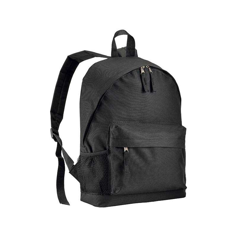 600D polyester 3-pocket backpack (one mesh side pocket). Adjustable shoulder straps and padded back