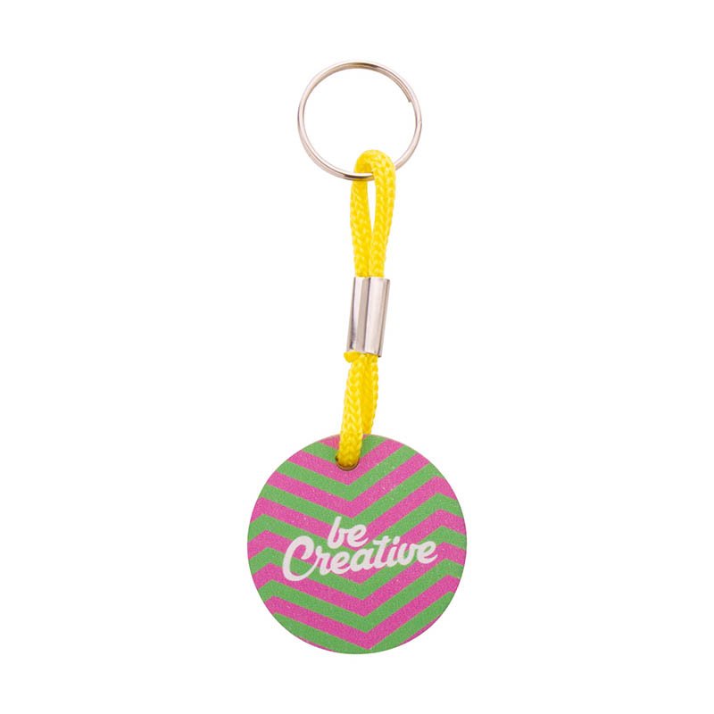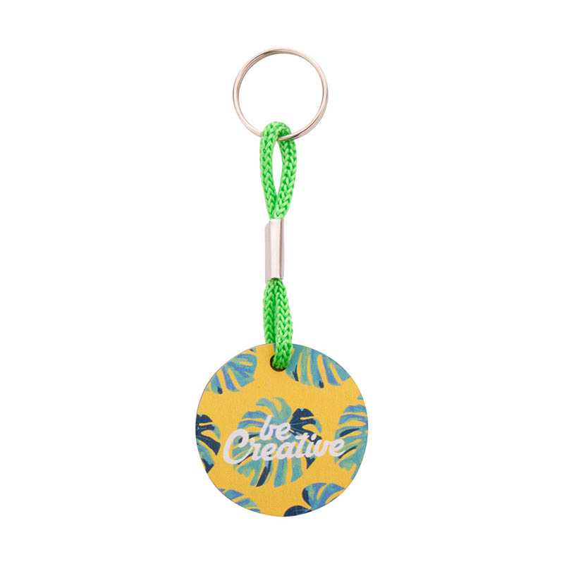 Kulatý přívěsek na klíče z březové překližky s barevným polyesterovým páskem a plnobarevným potiskem. Cena je včetně UV LED tisku na jedné straně, nezahrnuje tiskovou přípravu. Min. mn.: 200 ks.