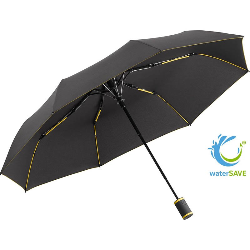 Convenient automatic function for quick opening, high-quality Windproof PLUS system for maximum frame flexibility in stormy conditions, flexible fibreglass ribs, polyester pongee material made of recycled plastics, eco-friendly thanks to original waterSAVE® cover material, with waterSAVE® label on the closing strap (with new deliveries), attractive design thanks to coloured ribs, handle rings and seams, soft-feel handle with push-button and promotional labelling option, convenient carry case with coloured seams and coloured flexible drawcord. Also available as another mini umbrella (art. 5084, 5484), midsize umbrella (art. 4784) and as golf umbrella (art. 2384).