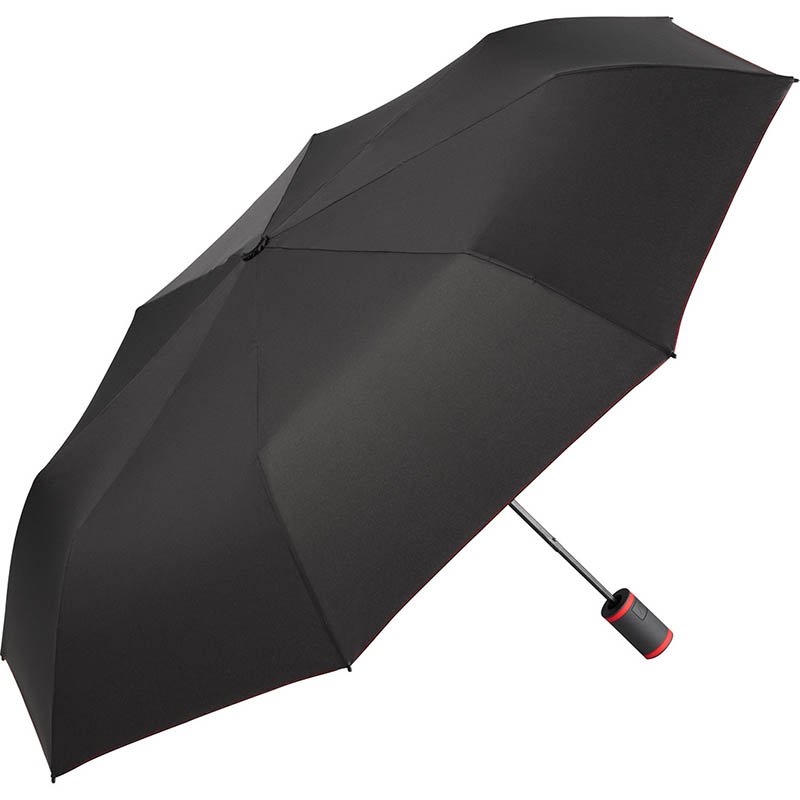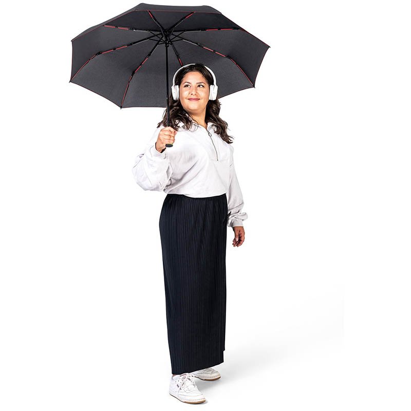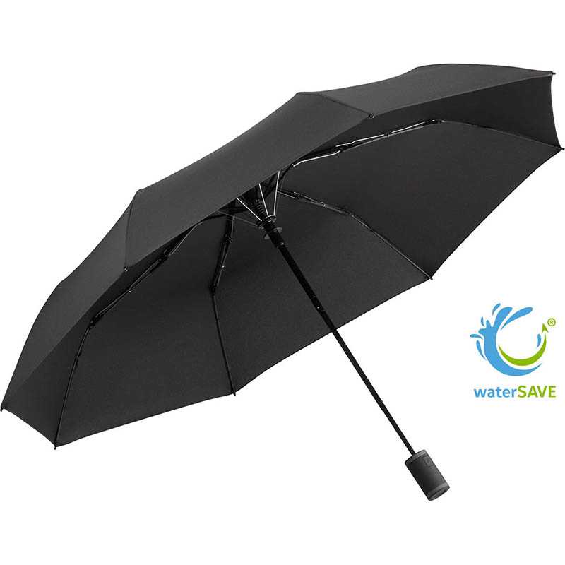 NOVINKA 2025. Convenient automatic function for quick opening and closing, high-quality Windproof PLUS system for maximum frame flexibility in stronger gusts of wind, black aluminium shaft, water-saving coloured polyester pongee waterSAVE® cover material made from recycled plastics, with waterSAVE® label on the closing strap, matt black plastic soft-feel handle with push-button and promotional labelling option, suitable for handbags thanks to super-light weight and compact size