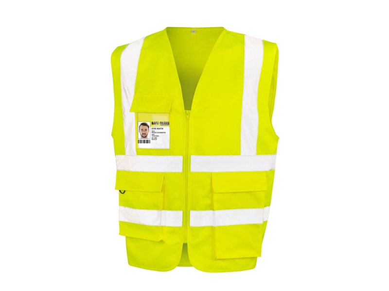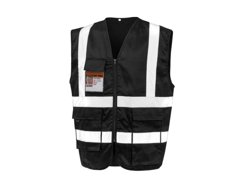 Easy to decorate, security vest in durable polycotton, with extra length pocket suitable for control or checking apparatus.