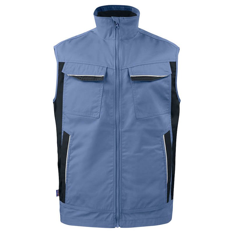 Padded service vest in easycare polyester/cotton. Basic features that fit most of the service industry, workshop and industrial jobs. High color density, that is, keeps the color well. Two chest pockets, D-ring for ID card holder. Zipper in the collar with internal windshield and chin protection. Front pockets with polyamide reinforcements. Prolonged back. Left inner pocket for mobile phones. Large right inner pocket with velcro fastening. Reflexes front and back. Product Fabrics: 65% polyester, 35% cotton, 245 g/m2, padding 100% polyester