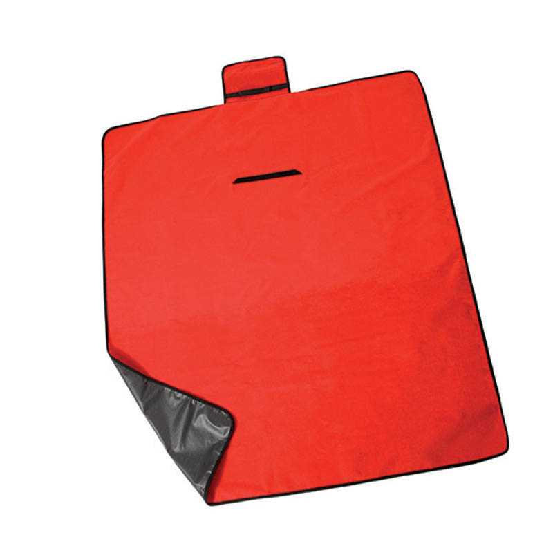 Fleece picnic blanket with waterproof PEVA underside and sponge filling. When folded up the blanket has an easy carry handle.