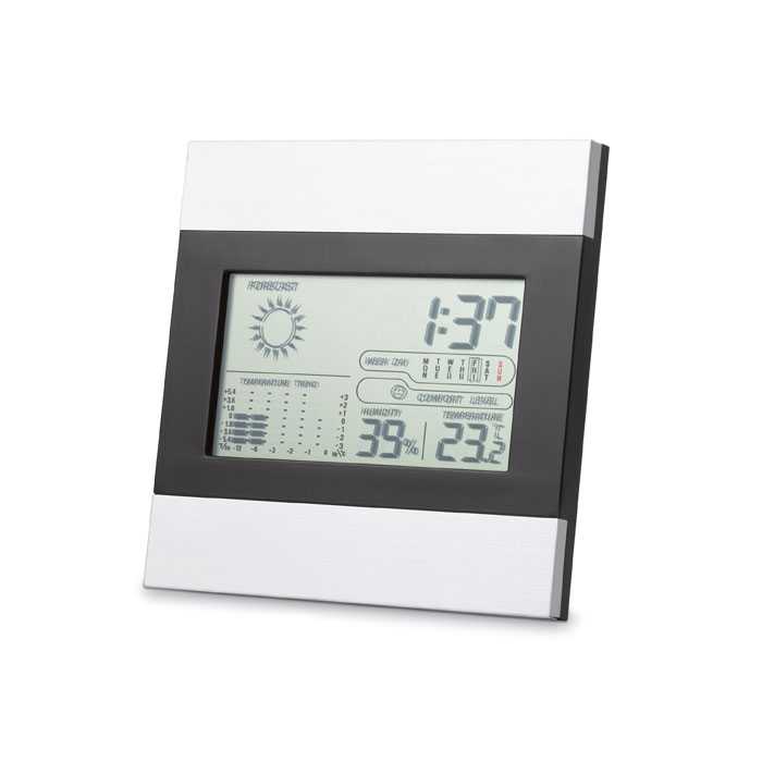 Weather station SHINY DAY with LCD screen, aluminium front, alarm clock, date display, thermometer, and a fold-out stand on the back