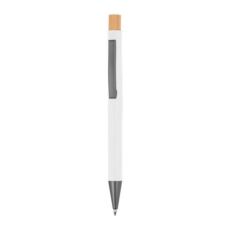Guľôčkové pero z recyklovaného hliníka s bambusovým tlačidlom, kovovým klipom a modrou náplňou.