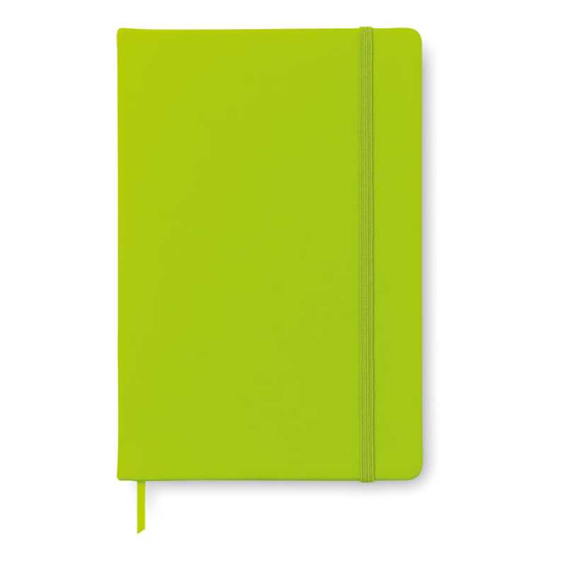 Zápisník A5 v tvrdých deskách s PU přebalem. 192 linkovaných stran (96 listů) recyklovaného papíru. Zavírací gumička a záložka v barvě.