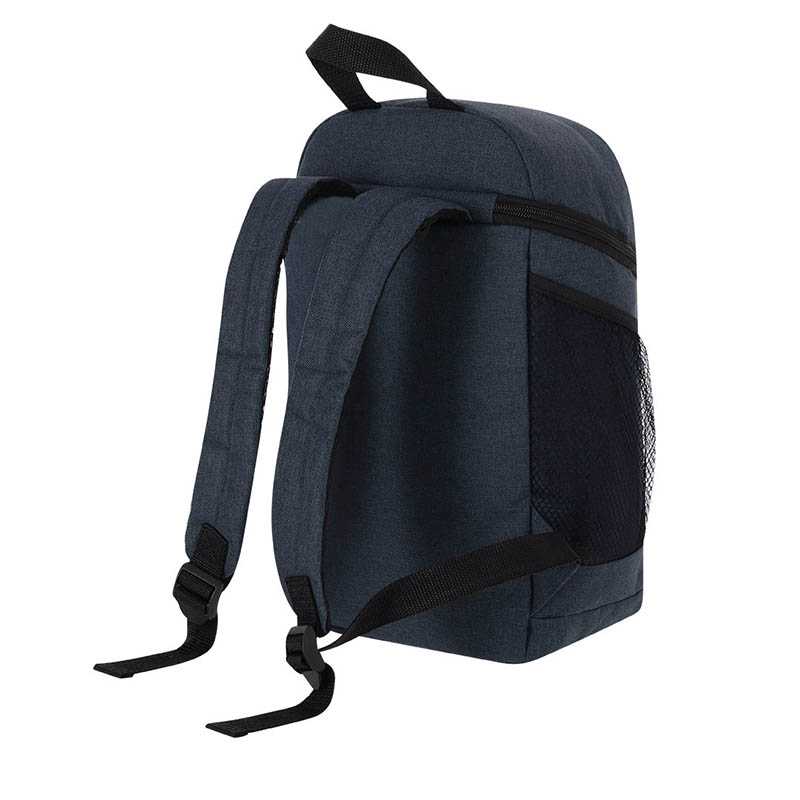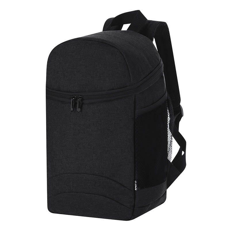 NOVINKA 2025. Large capacity cooler backpack made of durable high-quality RPET 600D polyester. Main compartment with double pull zipper, with PEVA interior. With side pockets made of mesh. Adjustable padded shoulder straps. Includes band on top. Fully padded. RPET label on the tag.RPET material is made from recycled plastic to promote the reuse of plastic waste and help the sustainability of the planet.
