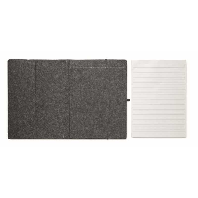 Konferenční složka A4 z plsti RPET. Poznámkový blok má 100 linkovaných listů recyklovaného papíru a gumičku na pero.