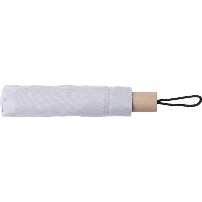 RPET 190T, foldable umbrella with eight panels and oak wood handle. Including pouch.