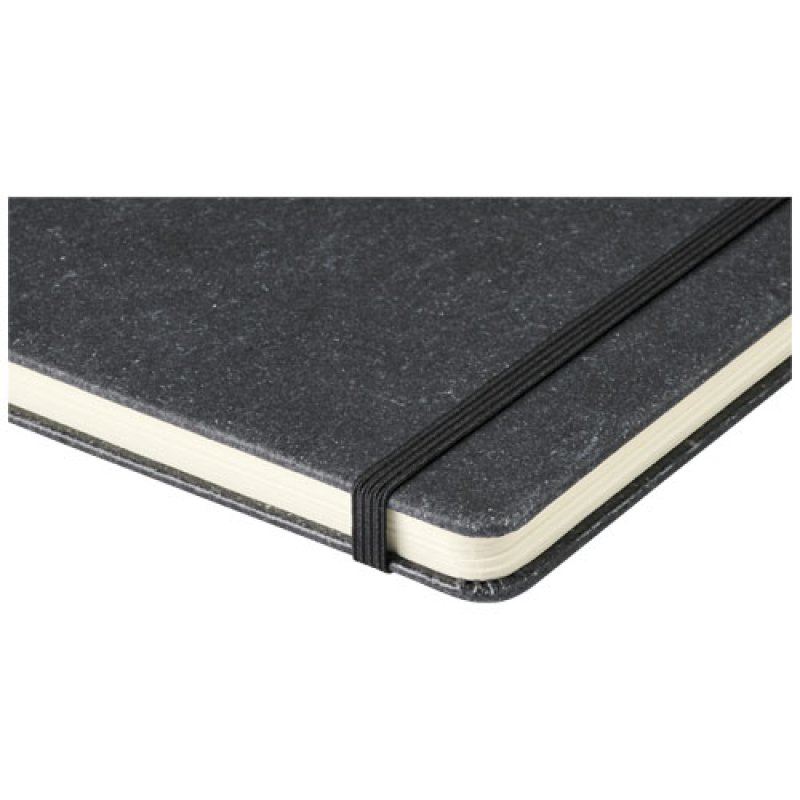Zápisník ve formátu A5 s obalem z kousků kůže. Je vybaven elastickým páskem, poutkem na pero, stužkovou záložkou a 80 listy linkovaného papíru 80 g/m2.