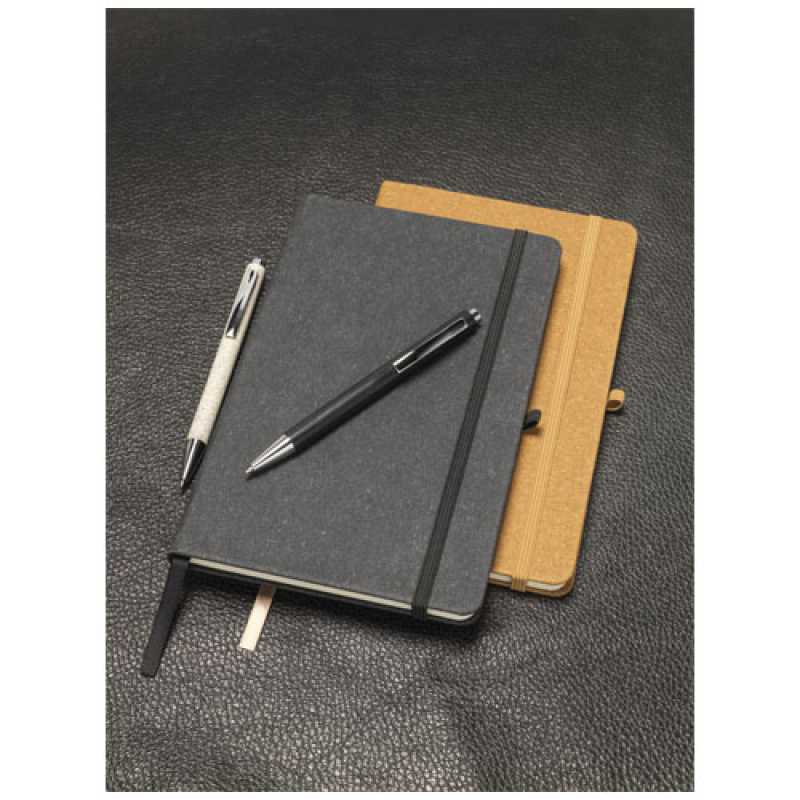 Poznámkový blok A5 s pevným krytom vyrobený z odpadu kávových šupiek (65 %) a bavlneného odpadu (35 %). Vnútorný papier je vyrobený z bavlneného odpadu (100 %) a je vysoko odolný. Obsahuje 120 linajkových strán a papierový pásik s kresbami. Pri výrobe tohto poznámkového bloku nevznikol žiadny odpad a neboli použité žiadne chemikálie ani stromy. Keďže výrobok je vyrobený z prírodných materiálov, farba a výsledok tlače sa môžu medzi výrobkami líšiť. 140 x 200 mm