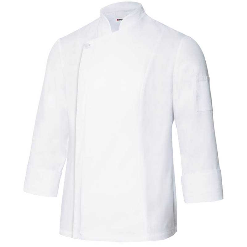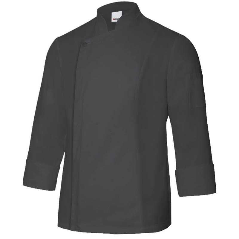 Covered asymmetrical front zip with button Mao collar Tailored sleeves with opening at cuffs Without side seam One pocket: 1 patch pocket on left sleeve