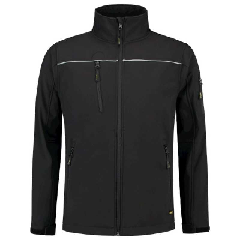 Functional layer 3 wind and water repellent softshell jacket. Two breast pockets, left with inner phone pocket. ID card holder. Two side pockets. Sleeve pocket on the left arm. Inner pocket on the left side with handsfree opening. Ventilation zippers under armpits. Drawcord waist. Adjustable cuffs. Extended back panel for better comfort. Reflective piping on sleeves and back. Removable and adjustable hood. Fleece lined collar for better comfort. Material: 100% polyester. Colour: red-35, navy-58, graphite-94 black-99 Size: XS-XXXL