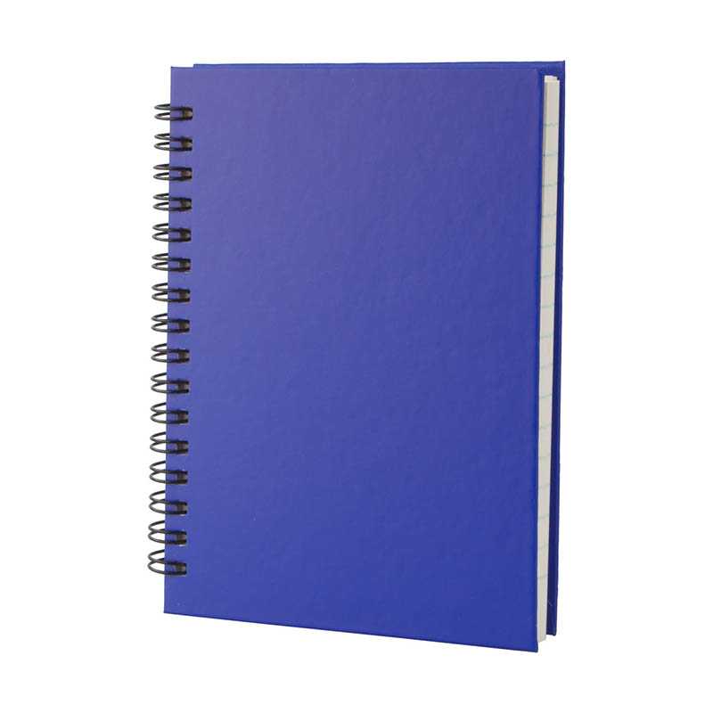špirálový poznámkový blok z recyklovaného kartónu od mlieka. Parametre: 140 linajkovaných strán, guľôčkové pero s modrou náplňou a gumené remienko.