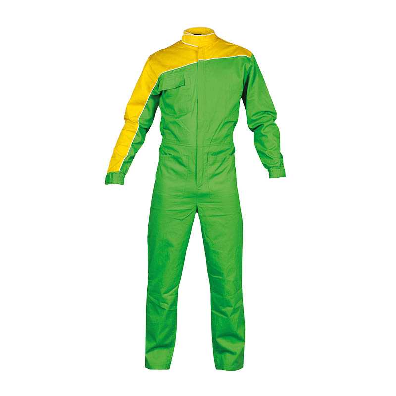 TWO-TONE OVERALL 65% polyester- 35% cotton - Covered full zip - Mandarin collar with velcro closure - Piping on collar, sleeve, chest and back - One chest pocket with double pen holder - Two opened pockets on front side - Elasticized fabric at waist on back side - Elasticized cuffs with velcro closure
