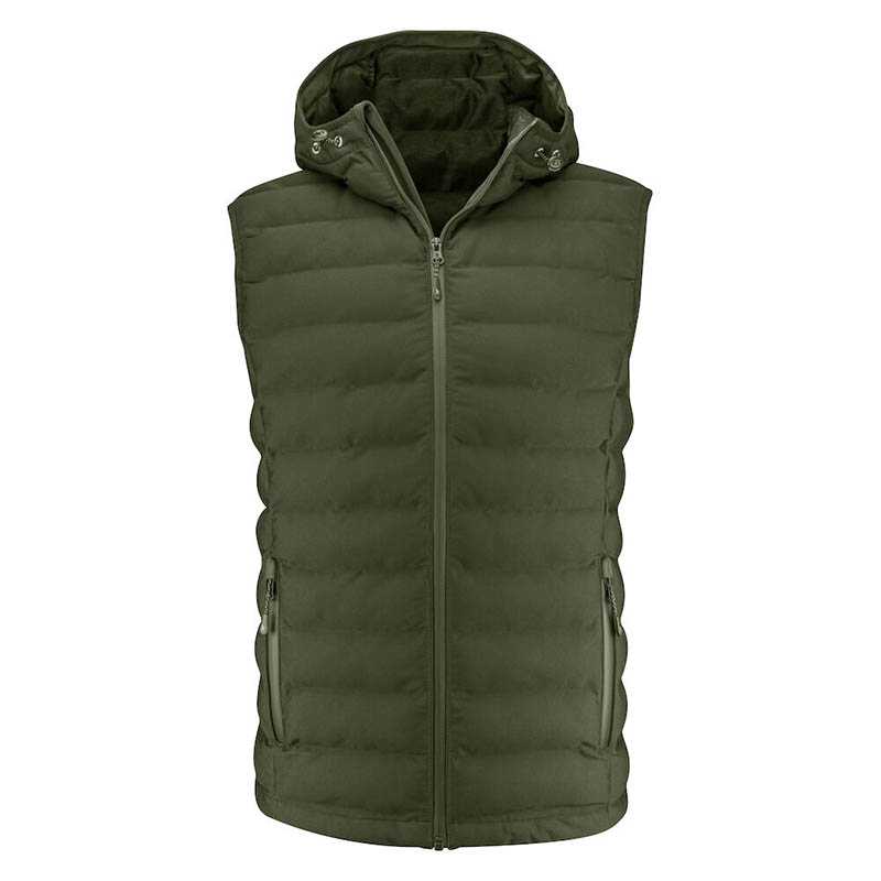 Padded vest in wind and water-repellent material. Two breast pockets, one with mobile telephone pocket and opening for headset. Two inner pockets, one with zipper. Dark reflective piping in yoke. One-hand drawstring at bottom edge. Material: 100% polyester Colour: stone-83, black-99 Size: XS-XXXL