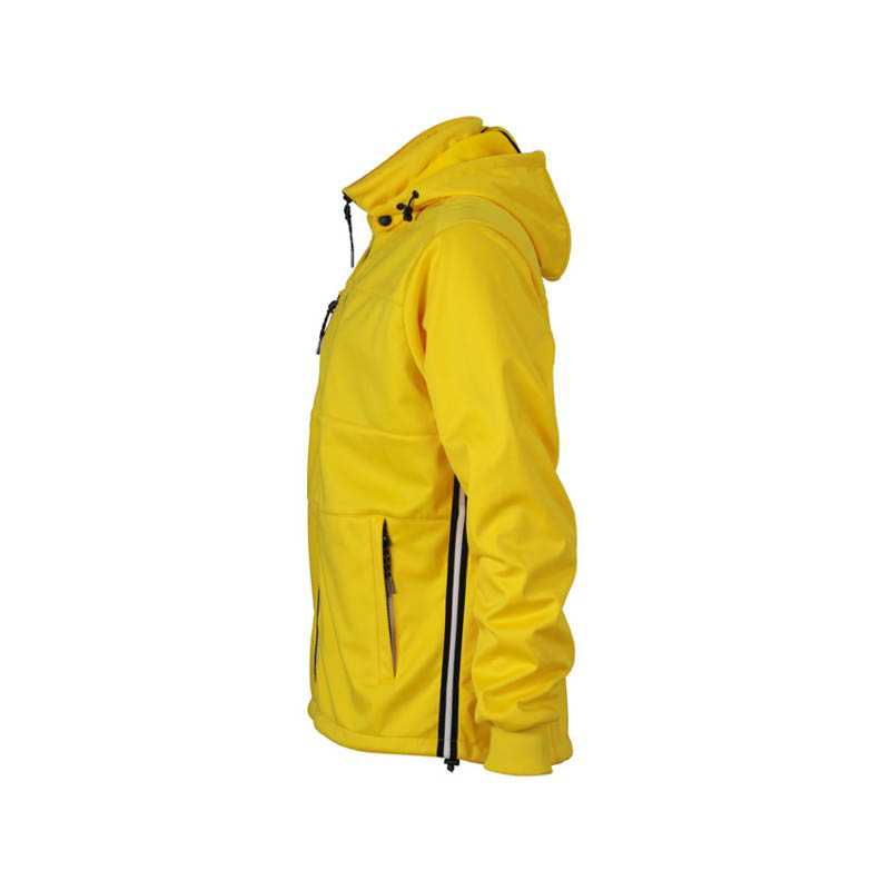 "Soft shell 2 layer padded jacket - 100% Polyester - Waterproof - Polyester padding - Polyester lining - Detachable sleeves - Detachable hood - Reflective thin band on the sides - Covered zippers - One chest pocket with zipper - Two outside pockets with z"