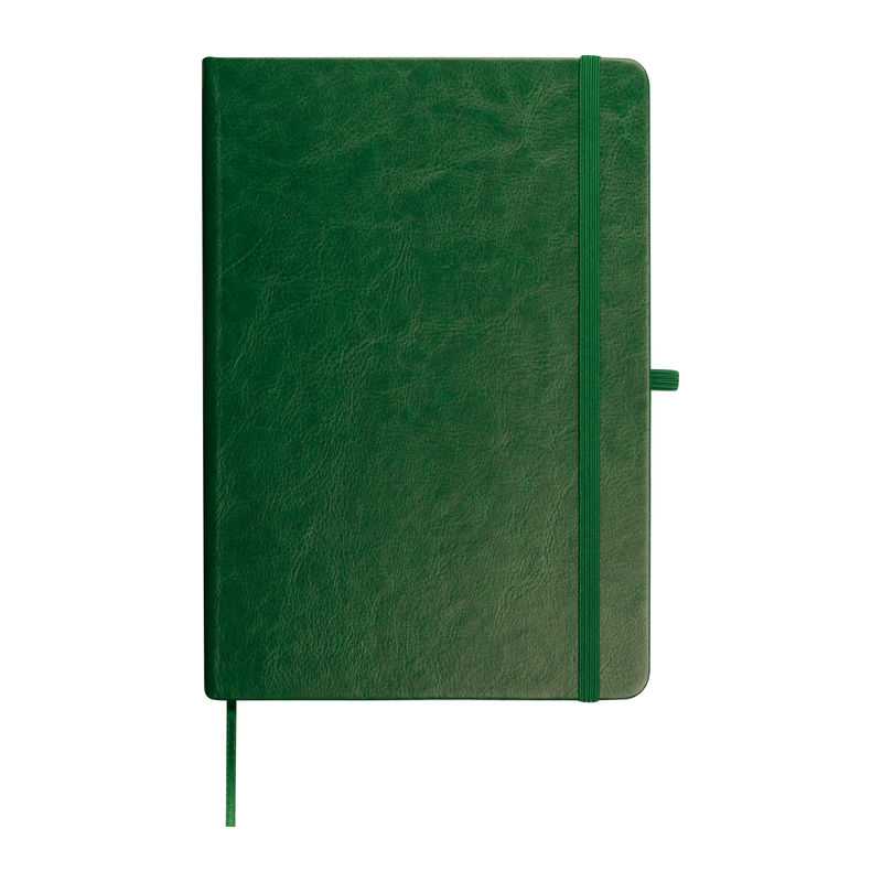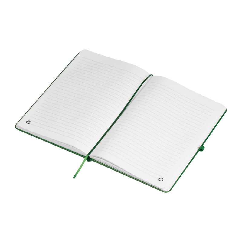 Zápisník s recyklovaným PU obalom, elastickým uzáverom a pútkom na pero. Obsahuje 192 linajkovaných strán vyrobené z recyklovaného papiera.
