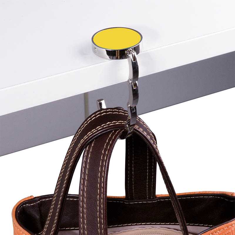 Round metal bag hook, dual-magnet reinforced closure, in a black box
