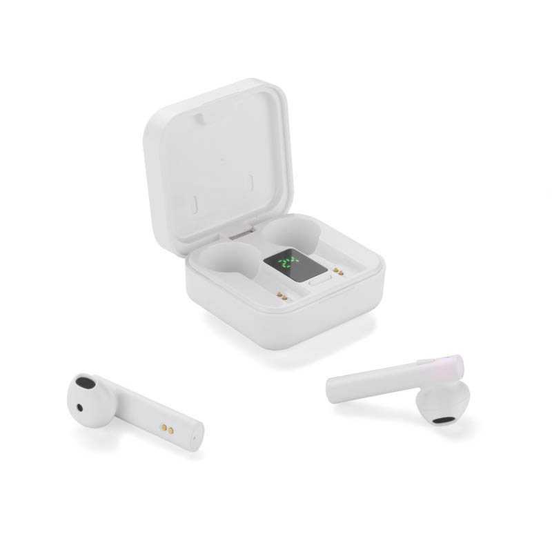 Bezdrôtové slúchadlá z kovu a ABS. Majú prenos BT 5'0 a 500 mAh batériu, približne 3 hodiny autonómie a až 300 hodín v pohotovostnom režime. Zahŕňa mikrofón, tlačidlo na odpovedanie na hovory a pripojenie k zoznamu skladieb mobilného zariadenia. Prípad nabíjania je zahrnutý a kompatibilný s micro USB. Dodávané v darčekovej krabici. 31 x 78 x 38 mm | Nabíjacia skrinka: 79 x 40 x 32 mm | Krabička: 128 x 110 x 58 mm