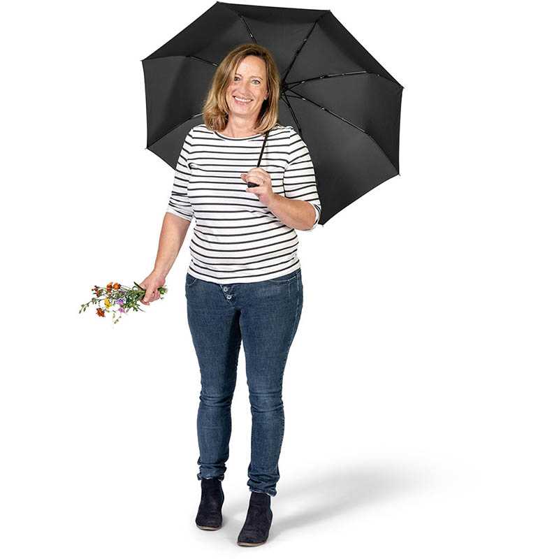 Easy to handle thanks to sliding safety runner, high-quality Windproof PLUS system for maximum frame flexibility in stormy conditions, polyester pongee cover material made of recycled plastics, with waterSAVE® label on the closing strap (with new deliveries), handle made of recycled plastic material with promotional labelling option