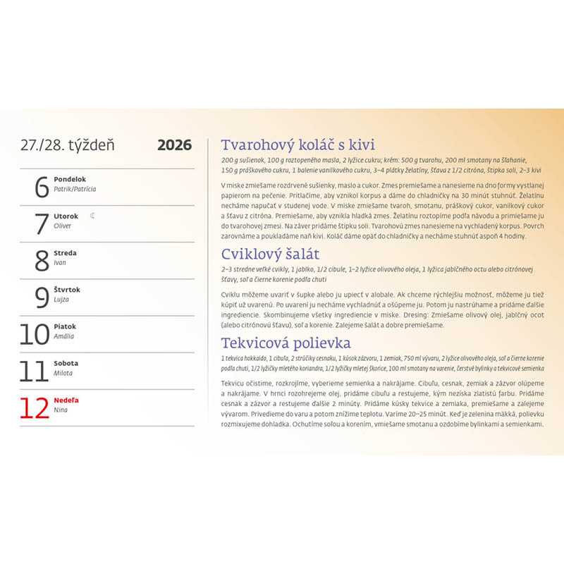 Milujete tradičnú slovenskú kuchyňu, ale radi vyskúšate aj niečo nové? Inšpirujte sa nástenným dvojtýždňovým kalendárom s obrázkami a receptami jedál a praktickými radami do kuchyne. Obsahuje slovenské a české mená, sviatky oboch krajín a fázy Mesiaca. Kalendár má dierku na zavesenie.