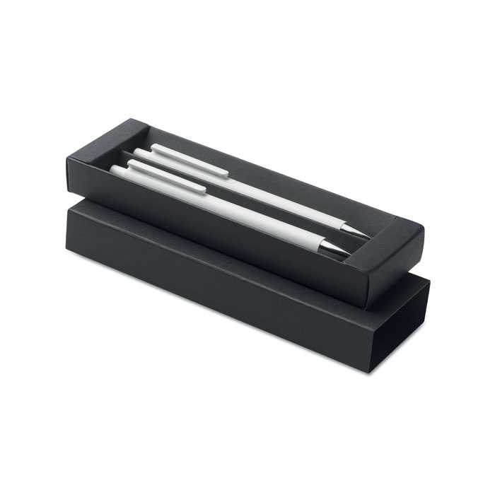 NOVINKA 2025. Eco-friendly set of ball pen and roller pen, made in recycled aluminium and with recycled ABS (RABS) details. Including: Ball pen in recycled aluminium with push-button mechanism, silver finish barrel and white fittings. With recycled aluminium logo on the top of the ball pen, jumbo cartridge and blue ink.Roller pen in recycled aluminium with push-button mechanism, silver finish barrel and white fittings. With recycled aluminium logo on the top of the ball pen, jumbo cartridge and blue ink.Set presented in an individual kraft design case with matching sleeve.Recycled aluminum has its origin in the almost infinite reuse of one of the materials with the greatest recyclability potential, keeping the quality of the resulting product. This feature turns it into an eco-friendly material of recycled origin, easily recyclable. Besides, new material and resources can be obtained from treatment and waste processes, consuming less energy among others sustainable factors.GRS Certification (Global Recycled Standard), which guarantees the recycled origin of the material used to manufacture the product.