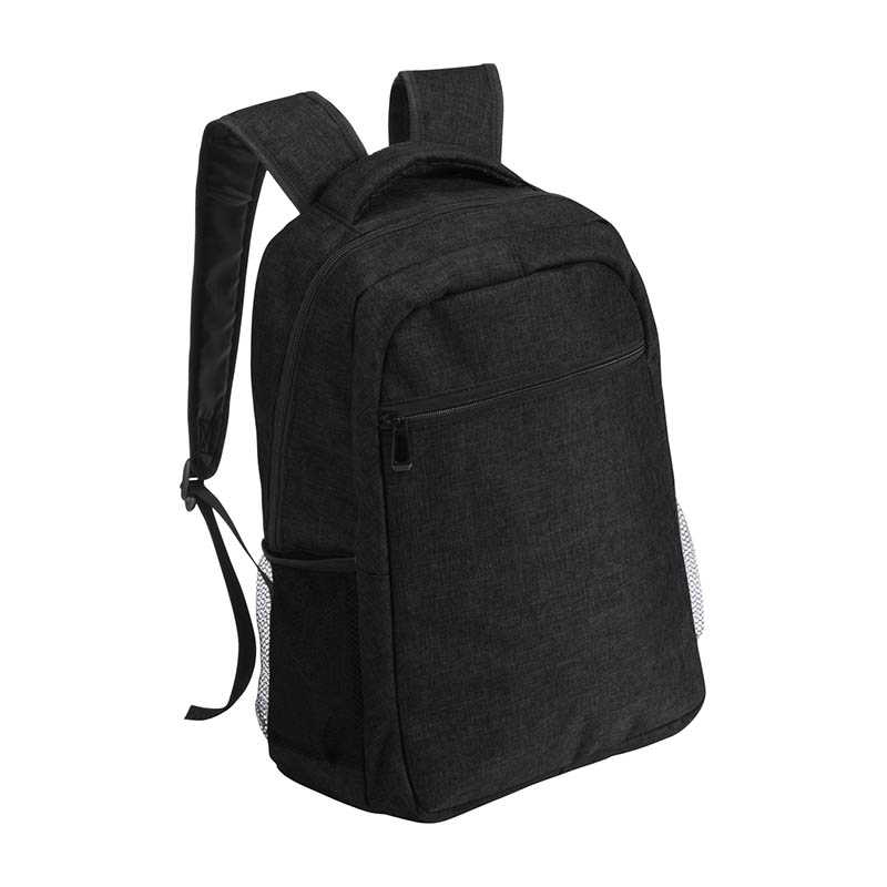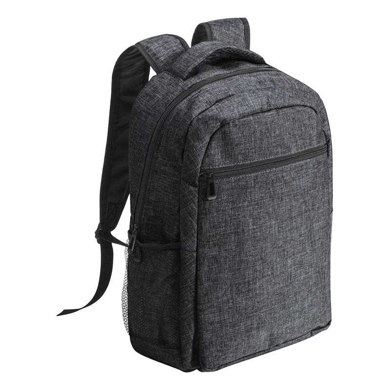 Polyester (600D + 300D) backpack with zippered front pocket and adjustable shoulder straps. Including USB port at the side.