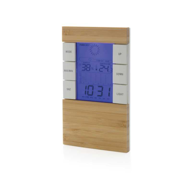 Meteostanica s LCD displejom a funkciami, ktoré zahŕňajú: teplota, vlhkosť, čas, deň, dátum. Vyrobené z RCS recyklovaného ABS plastu a FSC® bambusu. RCS (Recycled Claim Standard) je globálny štandard, ktorý umožňuje overiť použitie recyklovaného materiálu v produkte naprieč celým dodávateľským reťazcom. Celkový podiel recyklátu podľa váhy produktu: 42%. Vrátane AAA batérií na okamžité použitie. Balené v FSC® darčekovej krabičke.
