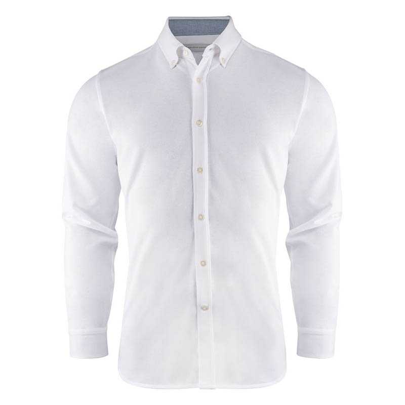 Product Name: Burlingham Item Number: 2113038 Product Fabrics: 60% cotton/40% polyester , 165 g/m2 Description: Oxford look jersey shirt. Woven details inside collar and side slits. Button down collar, adjustable cuffs and mother of pearl like buttons. Colours: 501 light blue / white, 601 navy / white, 901 black / white