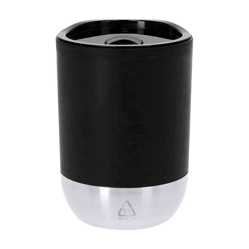 NOVINKA 2025. Dvojstenný termo hrnček s PP plastovou izoláciou s dnom z recyklovanej nerezovej ocele a viečkom na pitie. 300 ml.