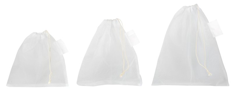 Fruit and vegetable mesh bag set BLUE PLANET SET: made of recycled materials, 3 differently sized bags, can be closed with drawstring, washable, reusable, with label to print on