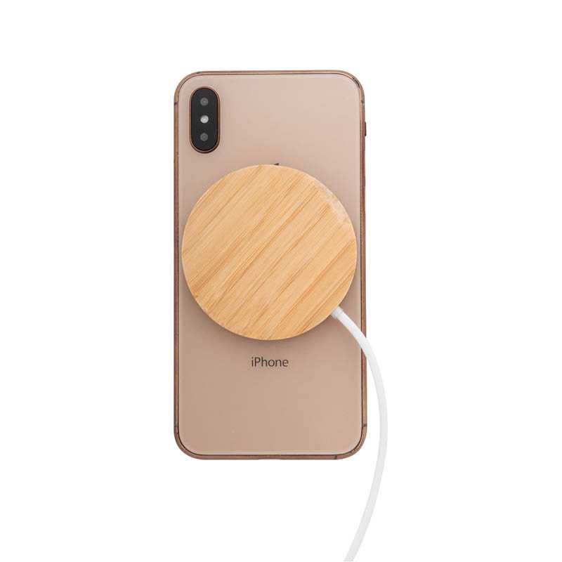 Magnetická bezdrôtová rýchlonabíjačka (10W) v bambusovom a priehľadnom plastovom kryte s viditeľnými elektronickými súčiastkami. Vrátane samolepiaceho kovového krúžku na použitie magnetickej funkcie na akomkoľvek bezdrôtovo nabíjacom zariadení. Kompatibil