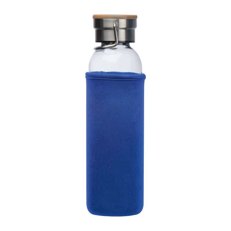 Sklenená fľaša na pitie s neoprénovým puzdrom, vrchnák z nehrdzavejúcej ocele s bambusovým vrchom, ucho na prenášanie a objem 600 ml.