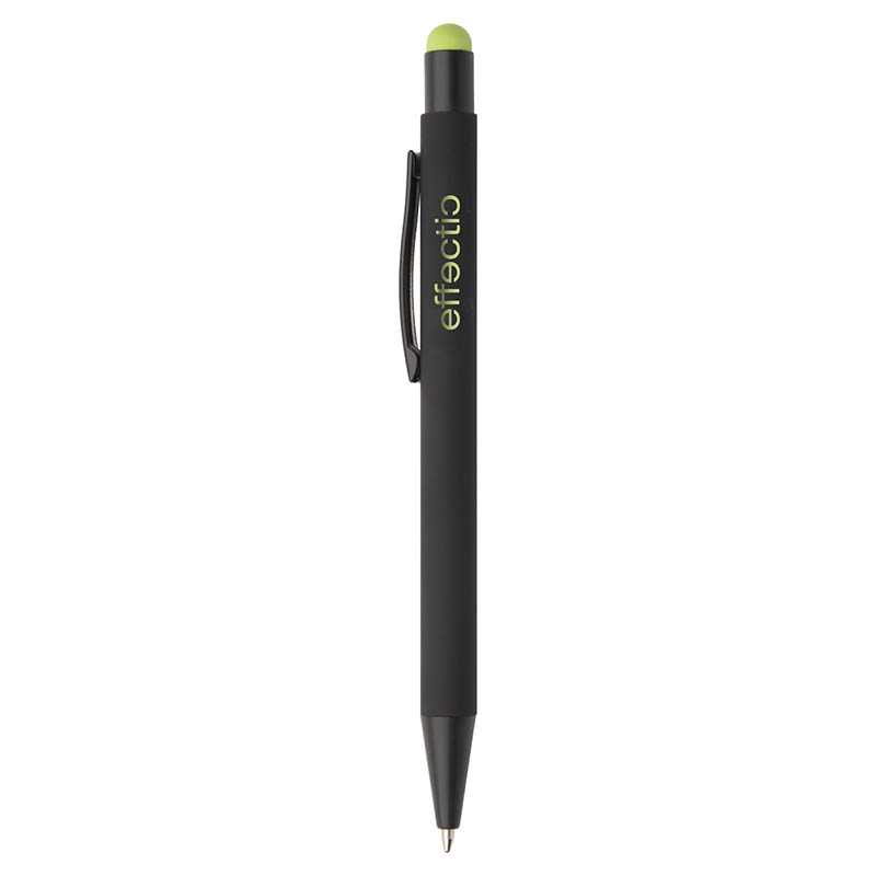 Hliníkové guľôčkové pero s pogumovaným saténovým povrchom príjemným na dotyk a modrou náplňou. Vybavené dotykovým perom (stylusom) a čiernymi doplnkami.