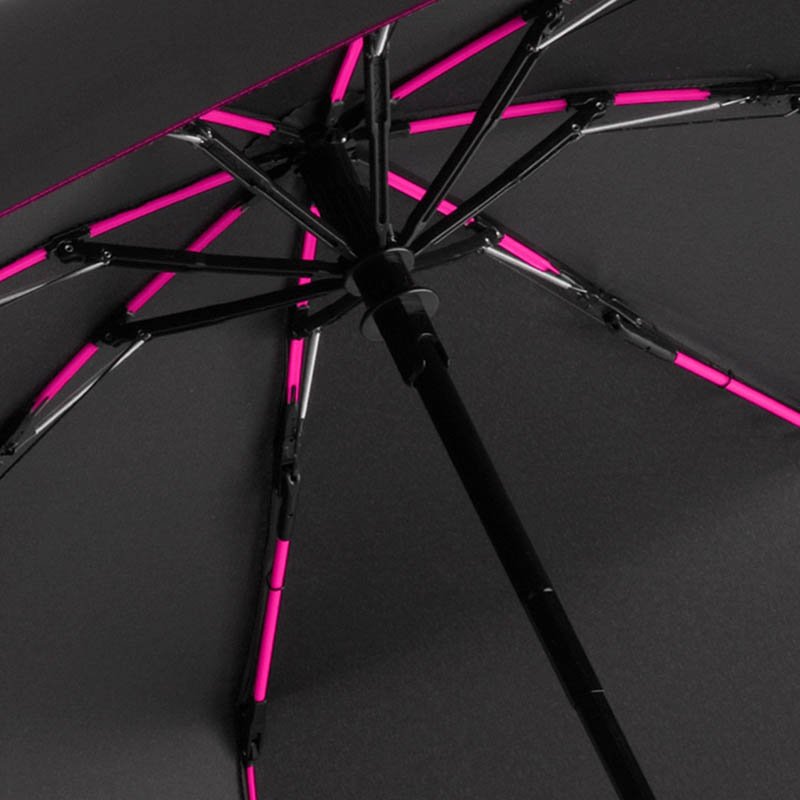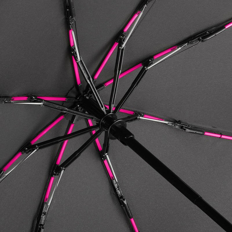 Convenient automatic open/close function for quick opening and closing, high-quality Windproof PLUS system for maximum frame flexibility in stormy conditions, flexible fibreglass ribs, chromed steel shaft, cover with trendy reflective piping in silver, aluminium finished handle with integrated push button and promotional labelling option