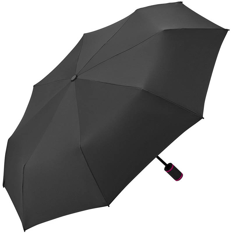 Convenient automatic open/close function for quick opening and closing, high-quality Windproof PLUS system for maximum frame flexibility in stormy conditions, flexible fibreglass ribs, polyester pongee material made of recycled plastics, eco-friendly thanks to original waterSAVE cover material made of recycled plastics, with waterSAVE® label on the closing strap (with new deliveries), attractive design thanks to coloured ribs, handle rings and seams, comfortable Soft-Feel handle with integrated push-button and promotional labelling option, convenient case with coloured seams and carrying straps. Also available as mini umbrella (art. 5084, 5584), midsize umbrella (art. 4784) and golf umbrella (art. 2384).