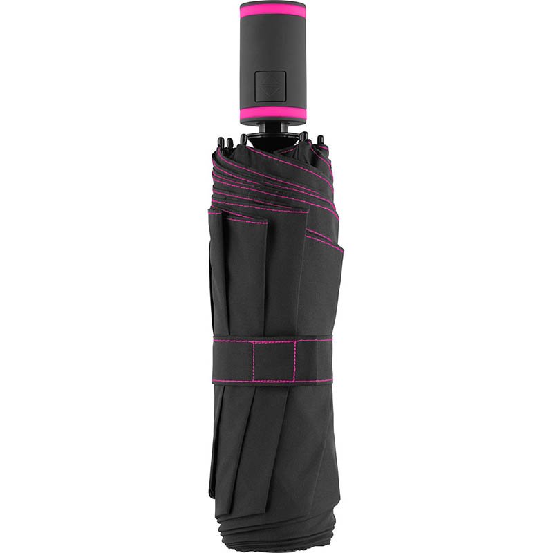 Convenient automatic open / close function for quick opening and closing, high-quality Windproof PLUS system for maximum frame flexibility in stormy conditions, striking cover decoration with coloured panel seam pipings, matt / shiny contrasting Soft-Feel handle with integrated push-button and promotional labelling option, coloured handle strap, sleeve with press button and coloured piping. Also available as midsize umbrella (art. 4399).
