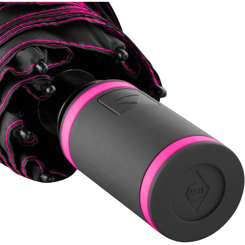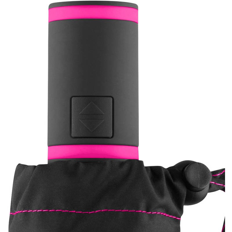 Easy to handle thanks to sliding safety runner, high-quality Windproof PLUS system for maximum frame flexibility in stormy conditions, plastic handle with carrying loop made of cover material colour-coordinated with the cover, special handle with silicone ring to ensure tight closing of the package, tube made of plastic with rubber lip for draining water and for the safe transport of the wet umbrella