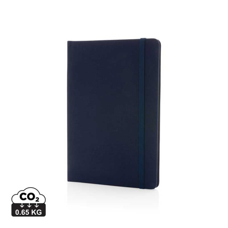 Poznámkový blok A5 s 80 čistými listami a hrebeňovou väzbou v kartónových doskách, vrátane guľôčkového pera v rovnakej farbe z recyklovaného papiera, s modrou náplňou.