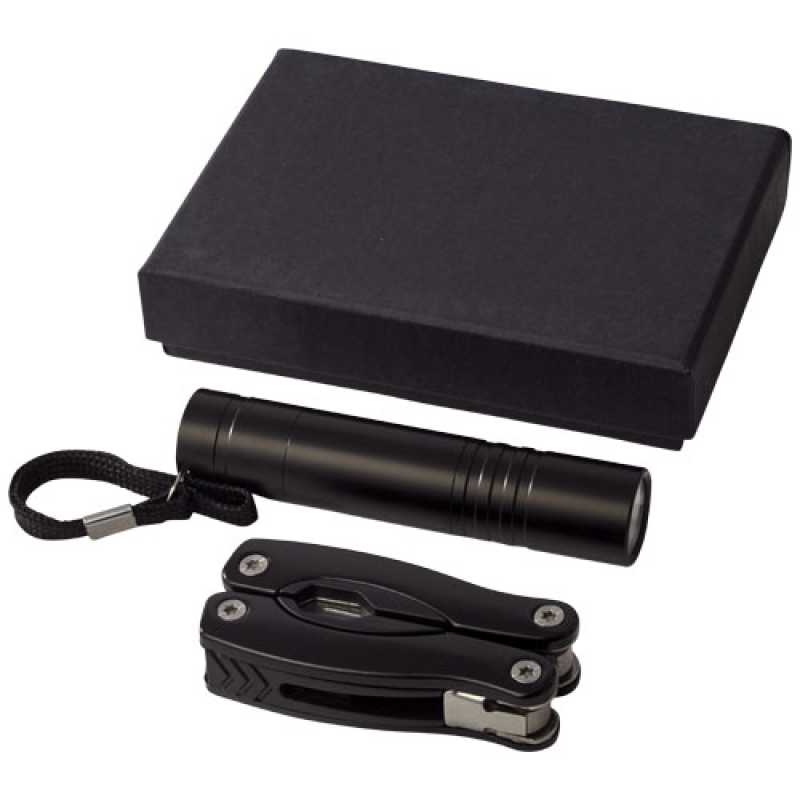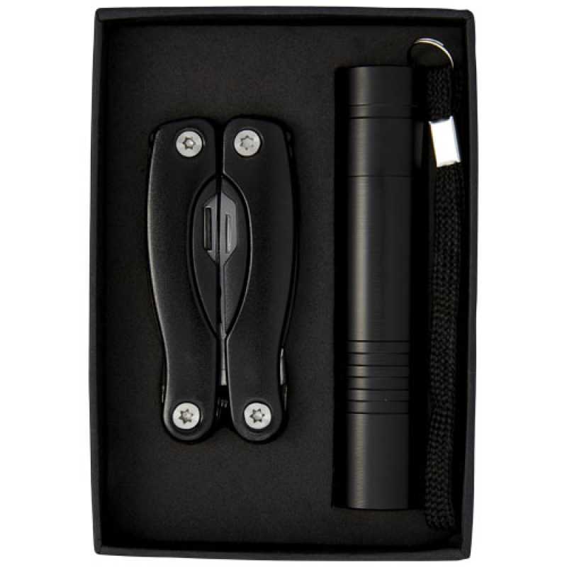 Mini multifunkční nástroj s 11 funkcemi a LED blikačkou v černé kartonové dárkové krabici s vložkou EVA. Baterie jsou součástí balení.