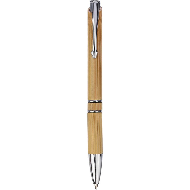NOVINKA 2025. Bamboo ballpoint pen with chrome metal details and a push button. Rings, push button, and tip in plastic. Metal clip. Approx. 800 meters of writing length. Black ink.