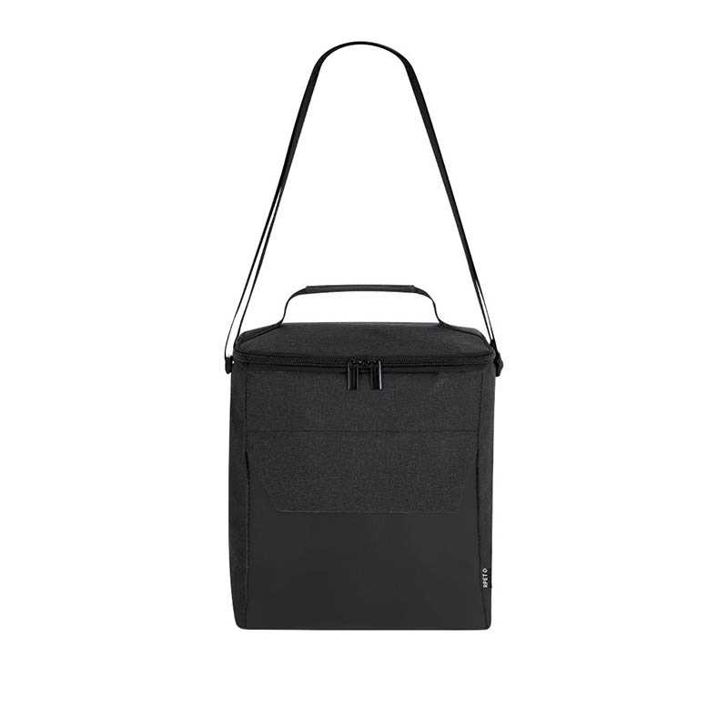 NOVINKA 2025. Cooler made from durable RPET 600D in combination with PU. Includes a main compartment with a zipper closure and double metal pull, with an insulated interior in PEVA. Front pocket with zipper closure. Includes adjustable shoulder strap and padded handle on top. Exterior label with RPET designation.RPET material is made from recycled plastic, promoting the reuse of plastic waste and helping the sustainability of the planet.