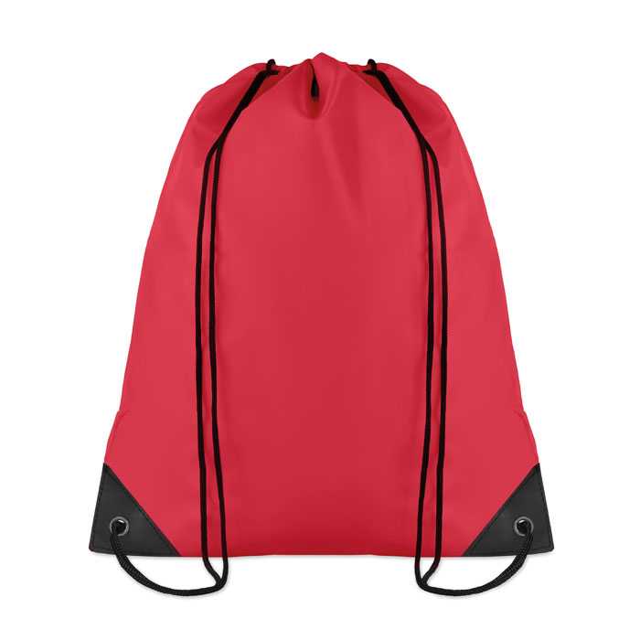 NOVINKA 2025. Drawstring backpack made in soft polyester, available in a wide range of colours. With black self-closing cords, reinforced PU leather corners I matching colour with the backpack and resistant metal eyelets. Special white colour for sublimation branding.
