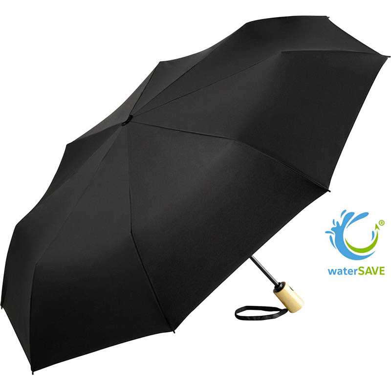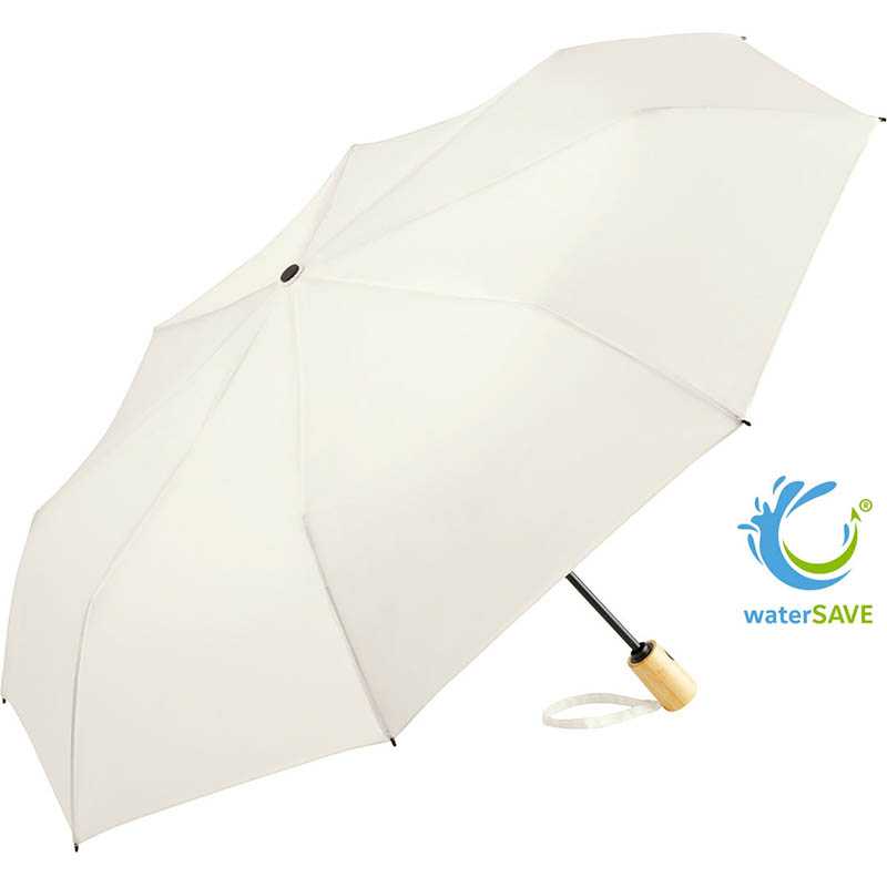 Convenient automatic open/close function for quick opening and closing, high-quality Windproof PLUS system for maximum frame flexibility in stormy conditions, polyester pongee cover material made of recycled plastics, with waterSAVE® label on the closing strap (with new deliveries), bamboo handle with black push-button and promotional labelling option. Also available as midsize umbrella (art. 7379).