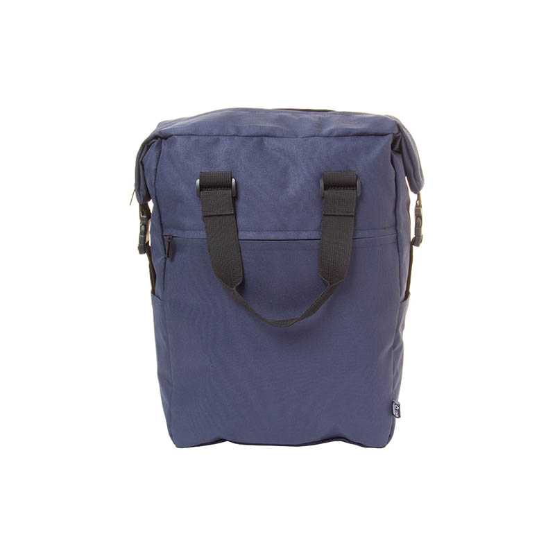 RPET polyester (600D) rolltop backpack. Two zipper pockets on the side. One large compartment. Velcro closing and buckle closing.