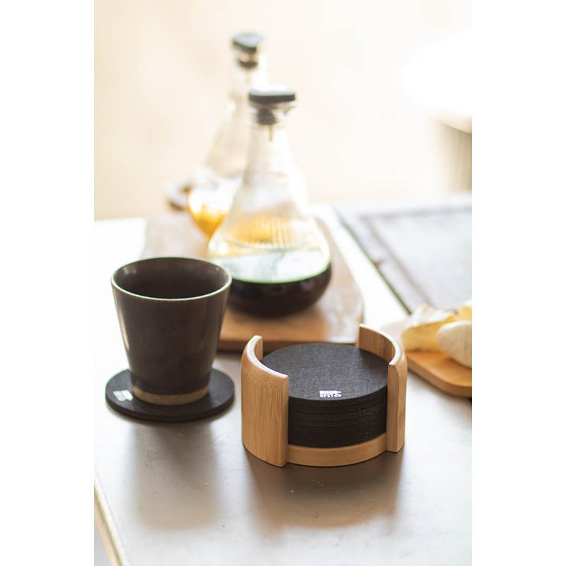 Súprava 10 ks RPET filcového podtácku v bambusovom držiaku na stôl. S výrazným logom RPET na každej tácke.