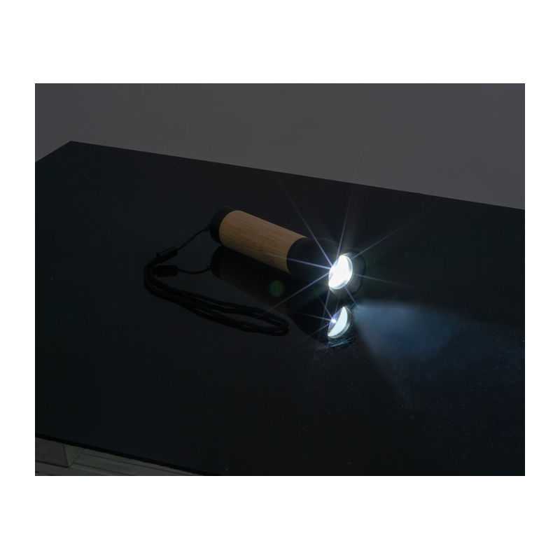 Nabíjateľná baterka z recyklovaného hliníka s bambusovou rukoväťou, výkonom 400 Lumenov a kapacitou batérie 300 mAh.