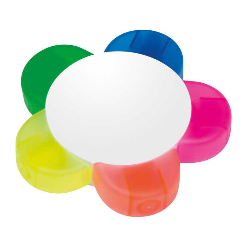 Plastový zvýrazňovač s 5 rôznymi farbami (oranžová, ružová, modrá, zelená, žltá) a veľkou plochou pre Vaše logo.